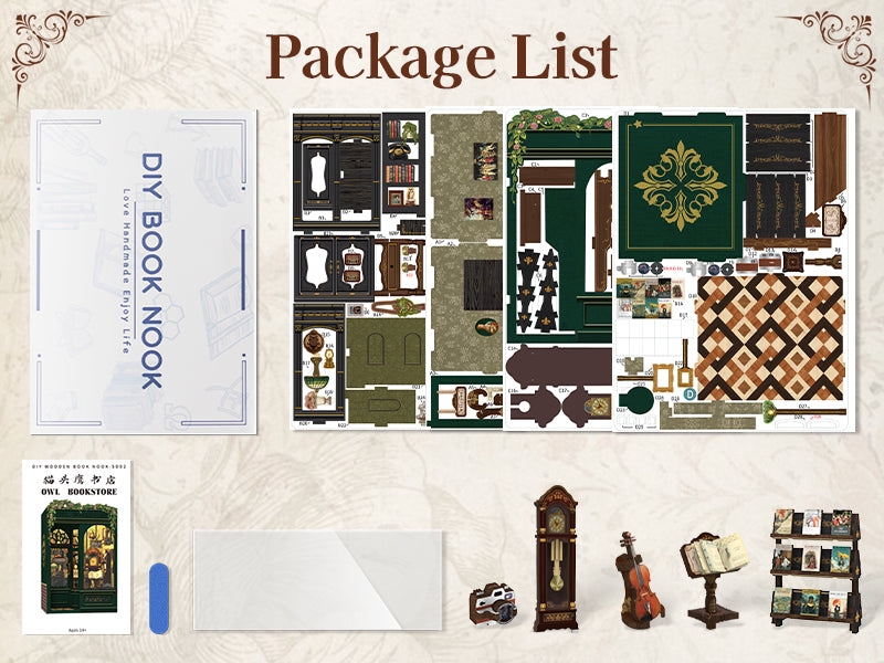 Reminder - The DIY book nook bookend kit has been 100% carefully checked before delivery to ensure that the accessories are complete and not missing. If you have any questions during assembly, please feel free to contact us. We will solve any problems as soon as possible. Note: You need to prepare silicone liquid glue and two batteries (type AAA).